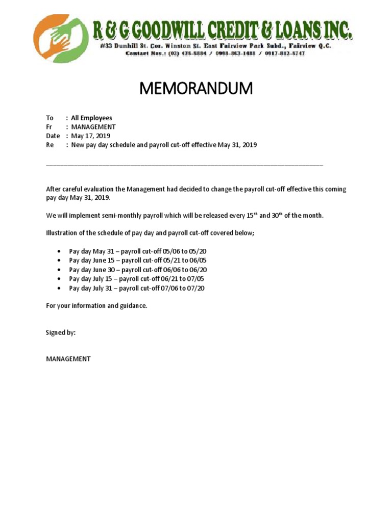 Changes to pay structure are among the most difficult to discuss because. They are also used to inform other company personnel about payroll policies. While not required, employers may find it helpful to provide employees with a … The body of a memo: When you're running a business, you regularly have to make decisions. Memo for employees informing the office close. Documents similar to memo on payroll cut off. Employee memos are used to provide information from the management to the entities to whom the specified memorandums, like meeting memos, are. Questions regarding the changes shared in this memo can be directed to accounts payable at. Providing an update on key projects or when you're communicating a message that employees will refer to more than once, such as a detailed. Refer to our templates if you will create this document. Letting an employee go can be challenging. Sometimes, changing payroll frequency doesn't affect all your employees.